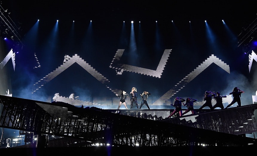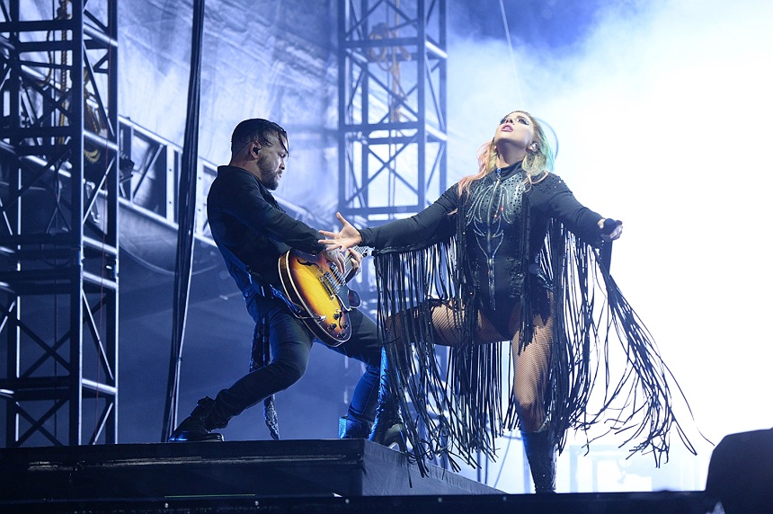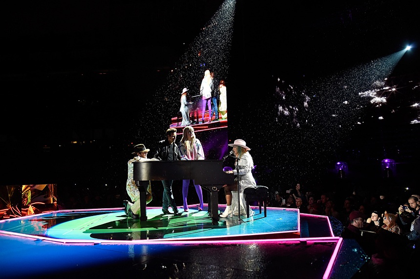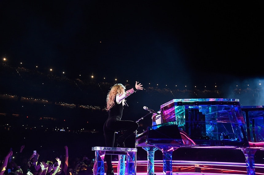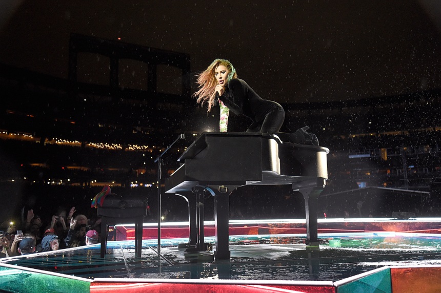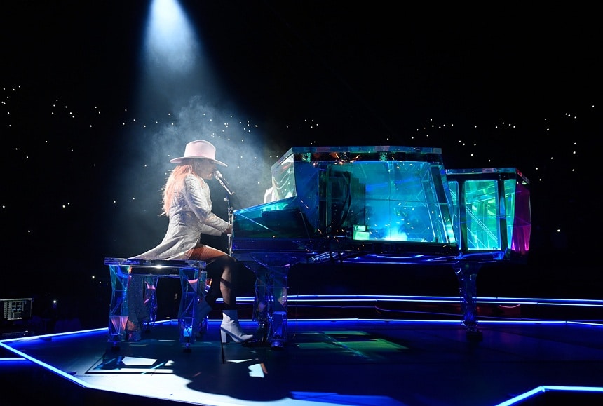 Gaga strolled the length of the bridges to go from stage to stage out to her grand piano for encore song “Million Reasons.”