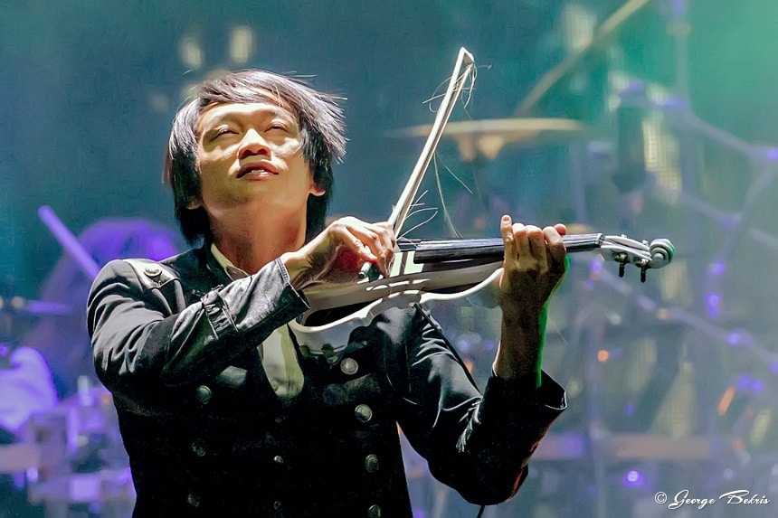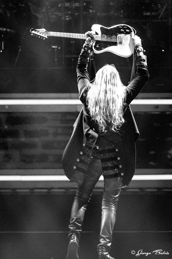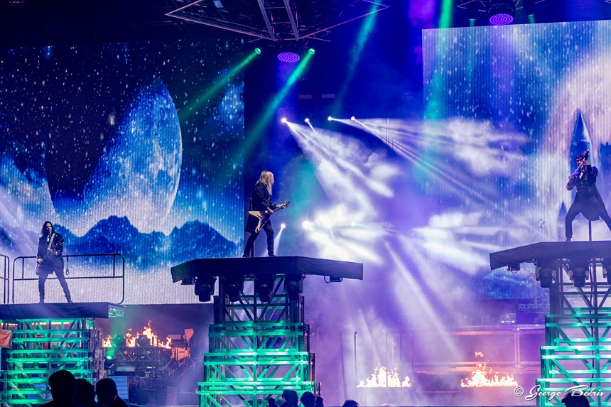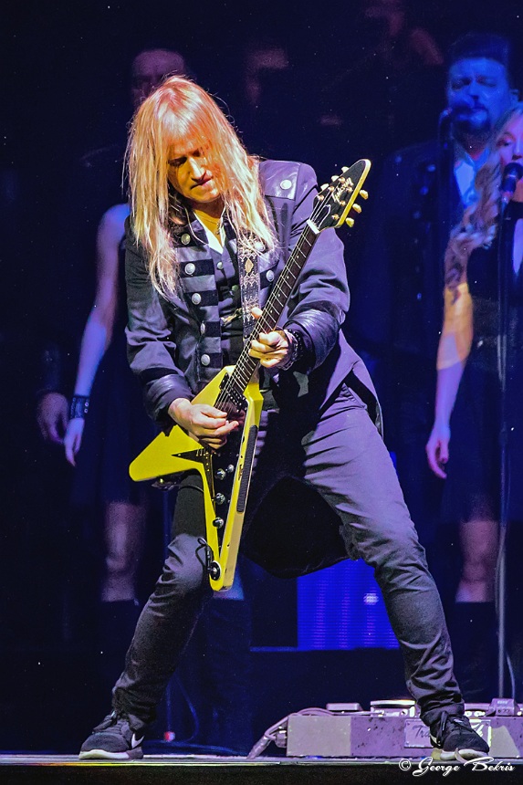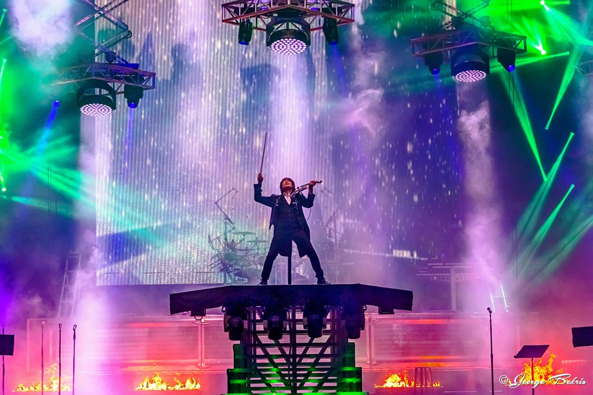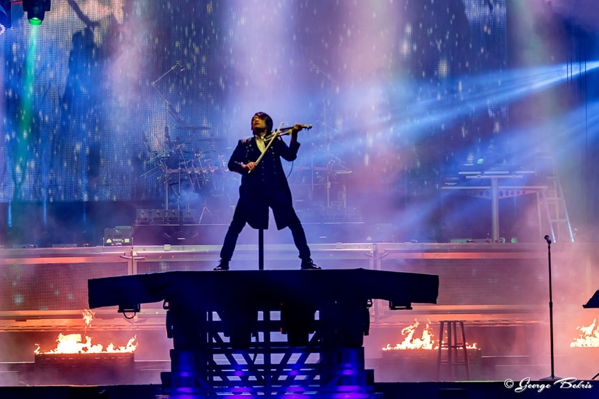 With each new season TSO changes the layout of the lasers and platforms that move. This year there were numerous risers for guitarists Chris Caffery and Joel Hoekstrar to strap onto as they performed. Roddy Chong on the violin was also hooked on to risers and floated above the stage in both the front and back of the arena. The arena was filled with smoke and flames. But, this year the entire backdrop was turned into many different sections of video screens all playing at the same time to expand the storyline well beyond the back of the stage. This year included the entire percussion section and keyboards on a stage that ascended up in the air about 30 feet during different numbers.